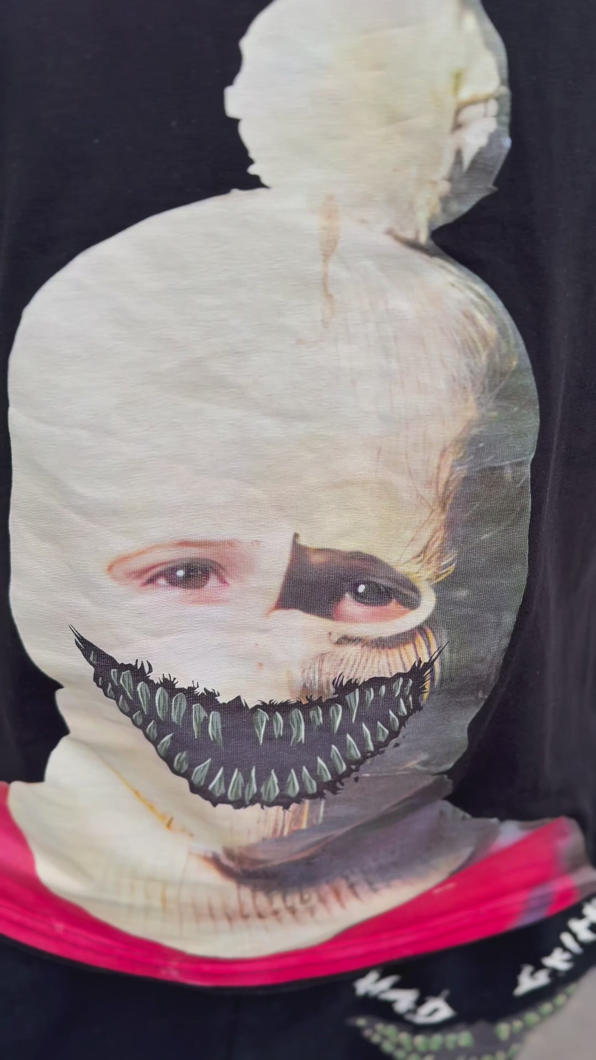 Design: Auffälliger gelber Schriftzug "SHOW ME YOUR MAD GRIN" auf der Rückseite